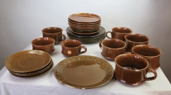Brun servis Bo Fajans, de flesta fat och koppar har nagg.