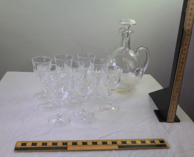 10576. 9 likörglas i kristall och kanna