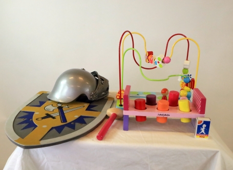 Sköld och hjälm, samt klossar och labyrint