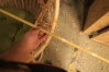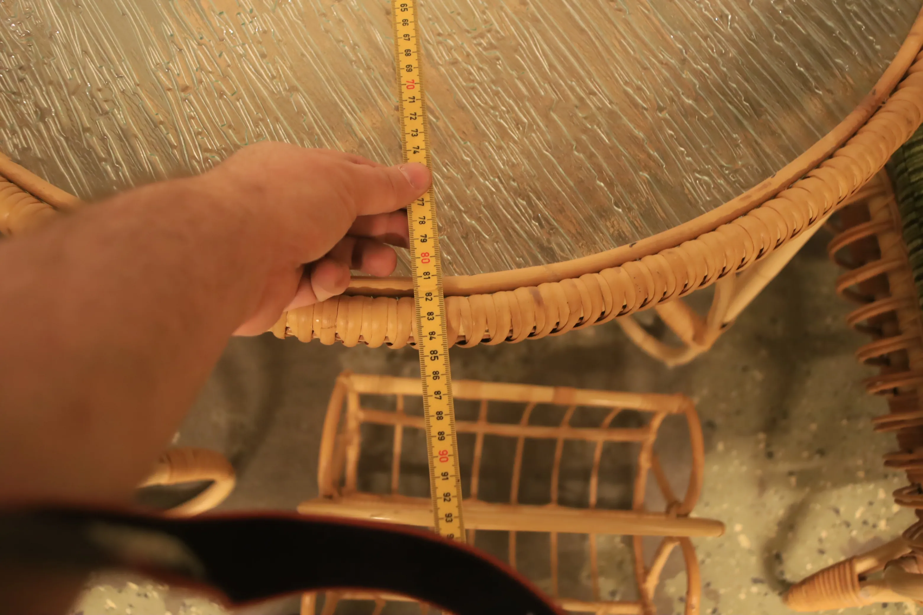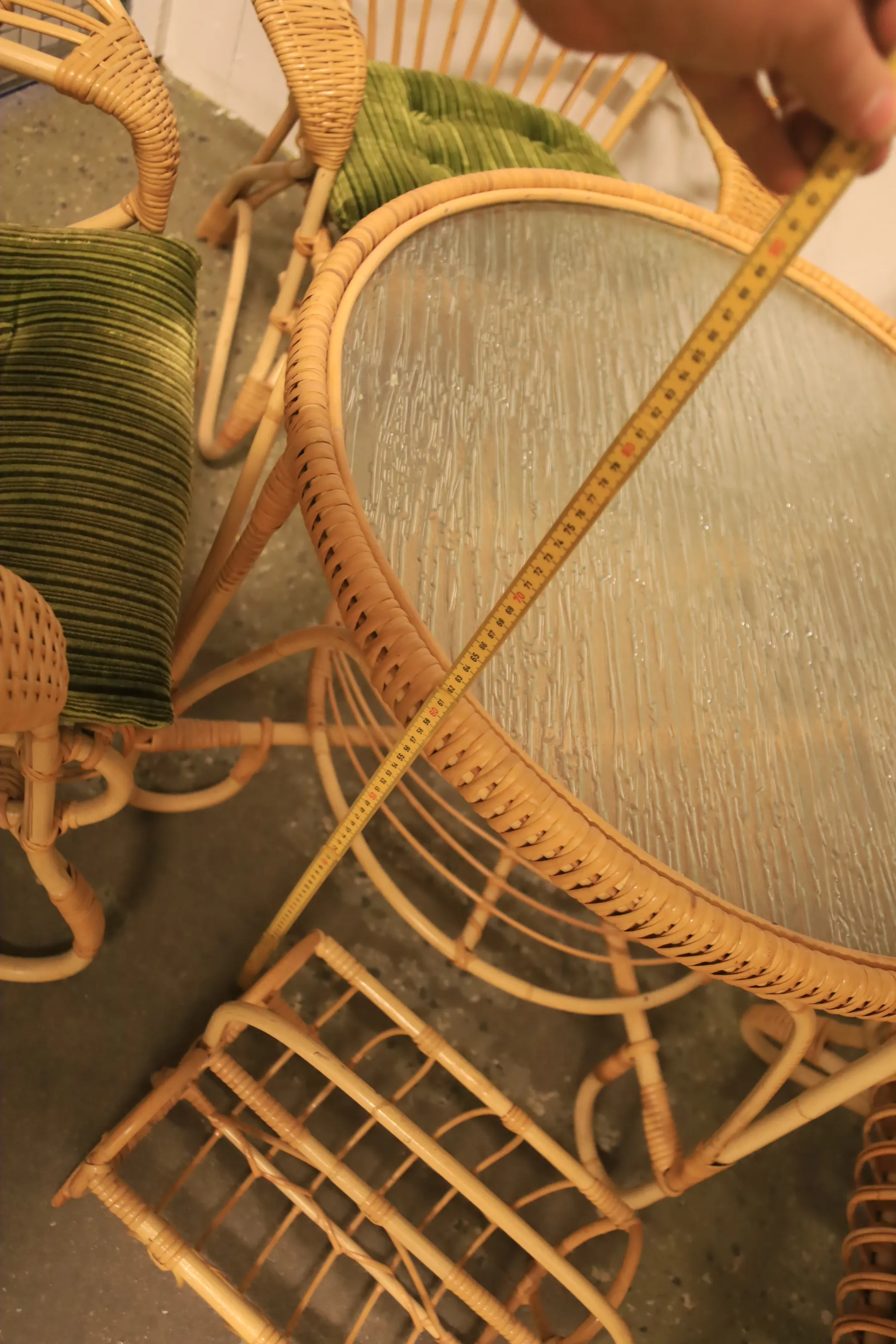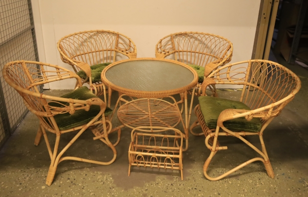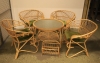 Bord med fyra stolar + tidningställ i rotting.