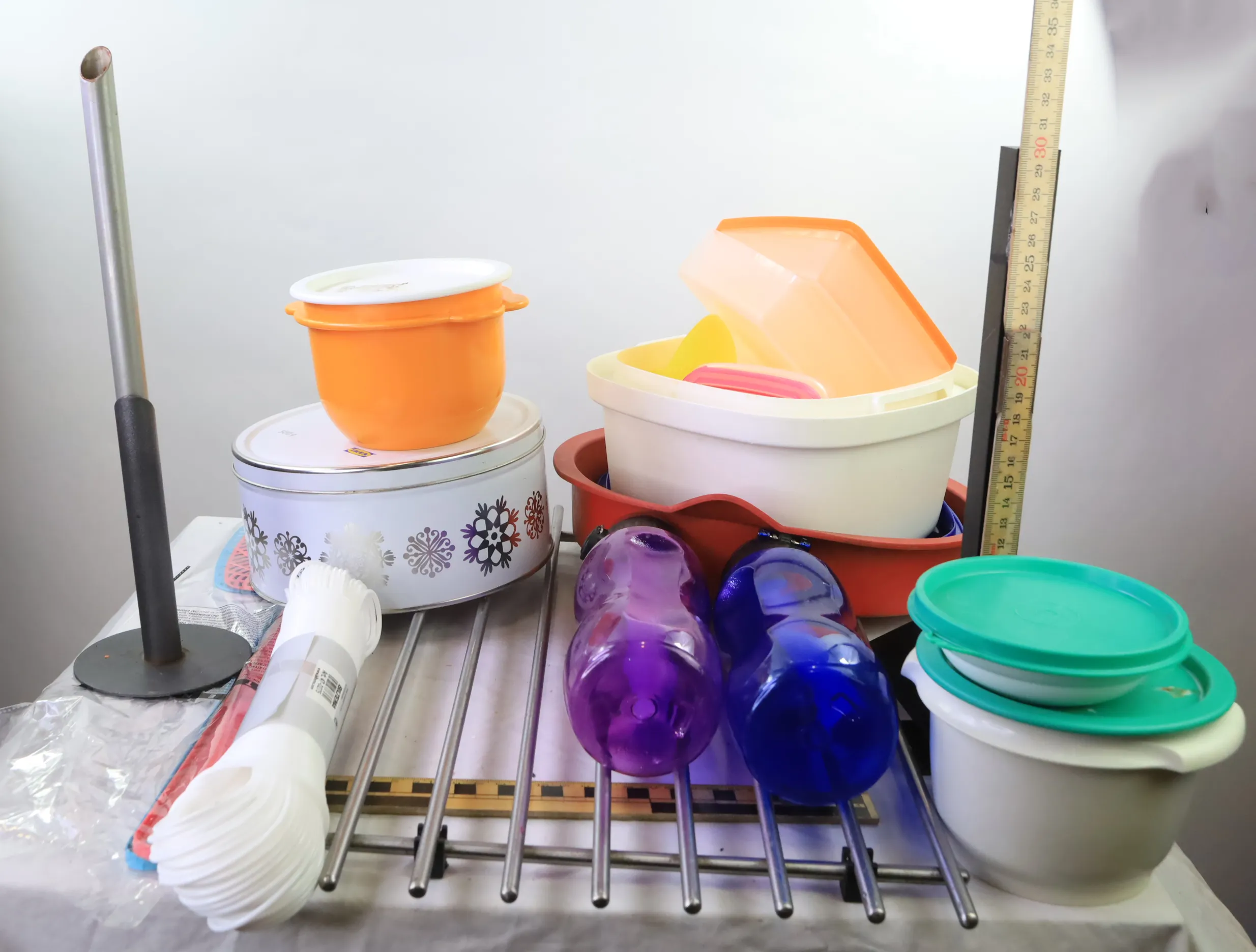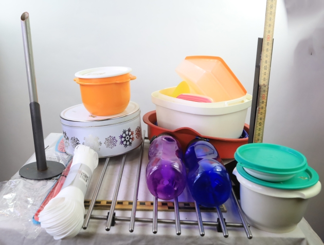 Diverse bla burkar, tvättlina, tuppervare, galler, flugsmälla etc
