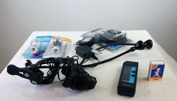 Diverse elektronik, fuktmätare, lampor, 8 volts kopplare med olika uttag.