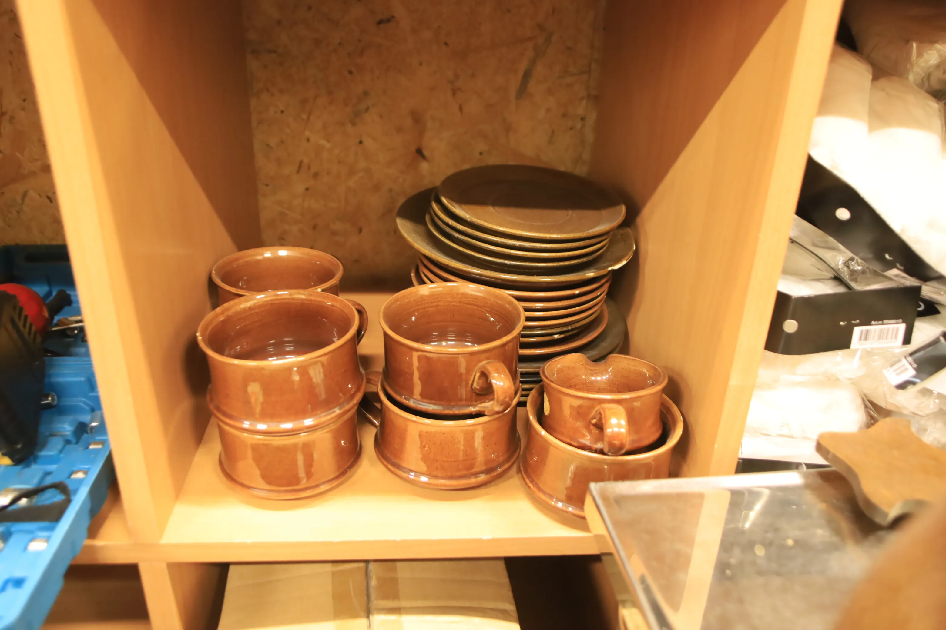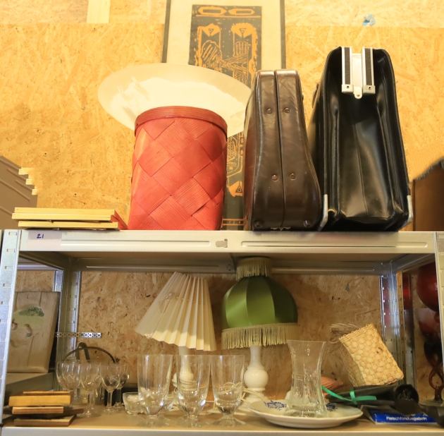 Allt på hyllorna, tre hyllor, porslin, väskor, lampor etc