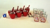 Glöggkoppar med skedar och glas med julmotiv.