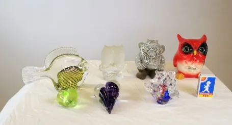 Olika skulpturer i glas och porslin