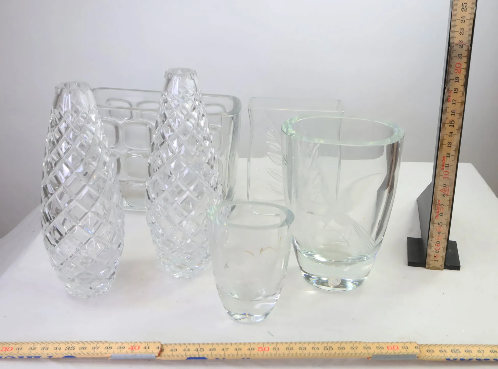 Glasvaser både i sodaglas och kristall, några med slipning har nagg