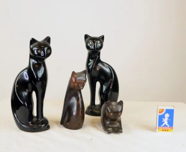 Kattfiguriner i porslin och trä