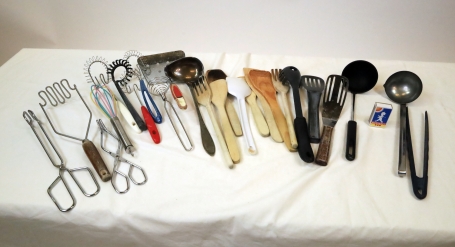 Diverse saker i köket. Pincetter, steksapdar, slevar etc