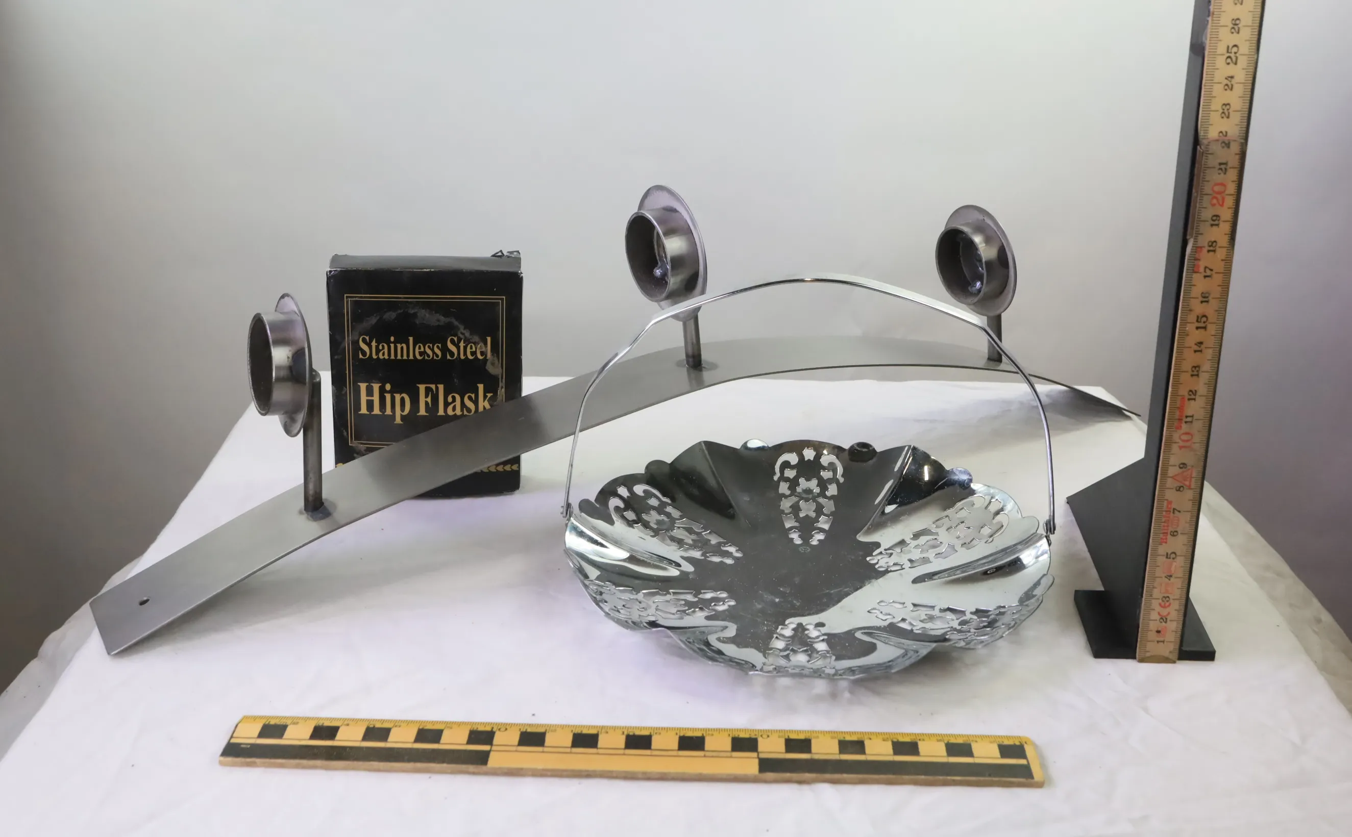 Ljushållare, skål och fickplunta i metall