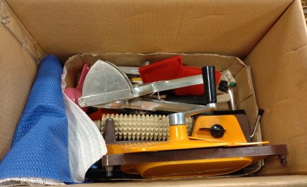 Låda med diverse köksutrustning