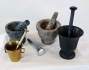 4 stycken mortlar + en mortelstav. Ena mortelsn i sten har en lagad skada.