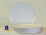Sex stycken tallrikar som det står Pizza på.
