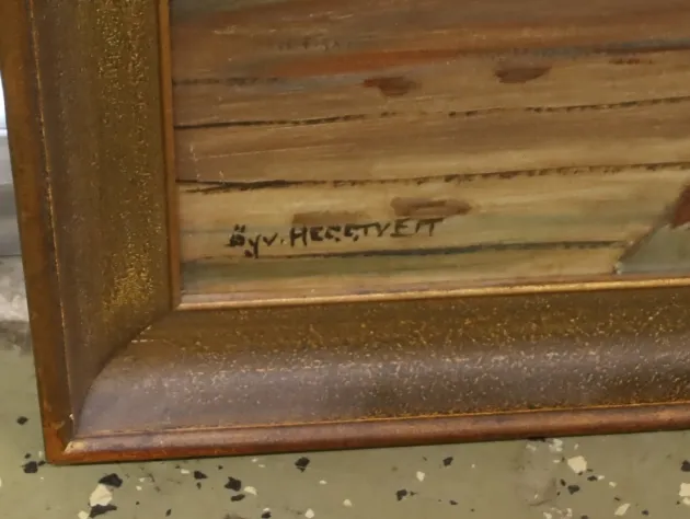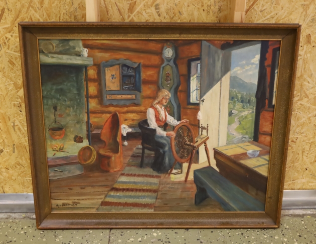 Stor oljemålning kvinna vid spinnrock, signerad, 111 x 93 cm