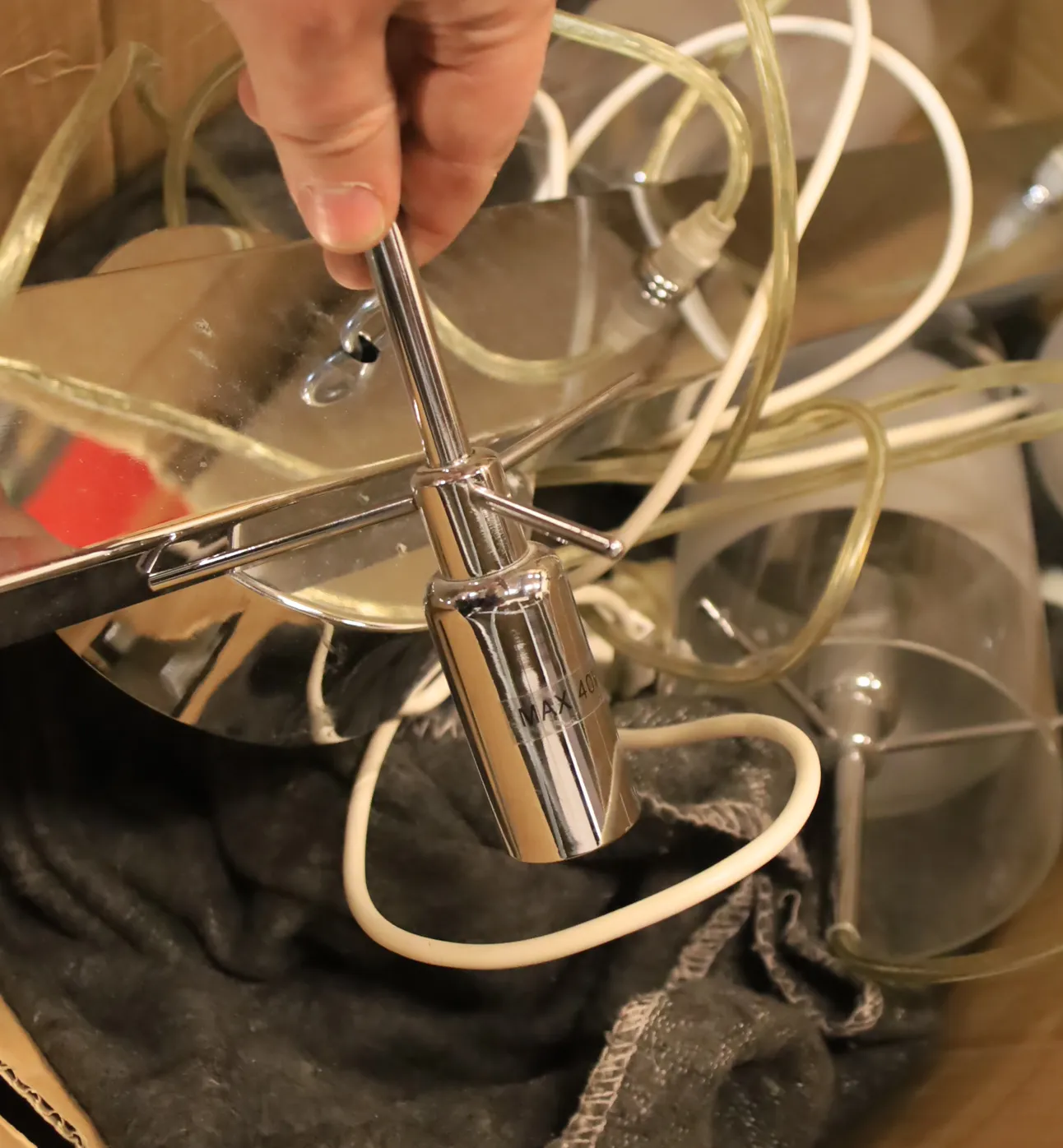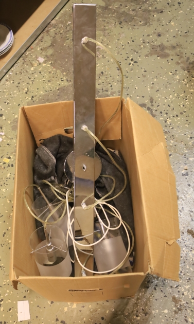 Taklampa med fyra lampor , ena glaset till en av lamporna är borta.