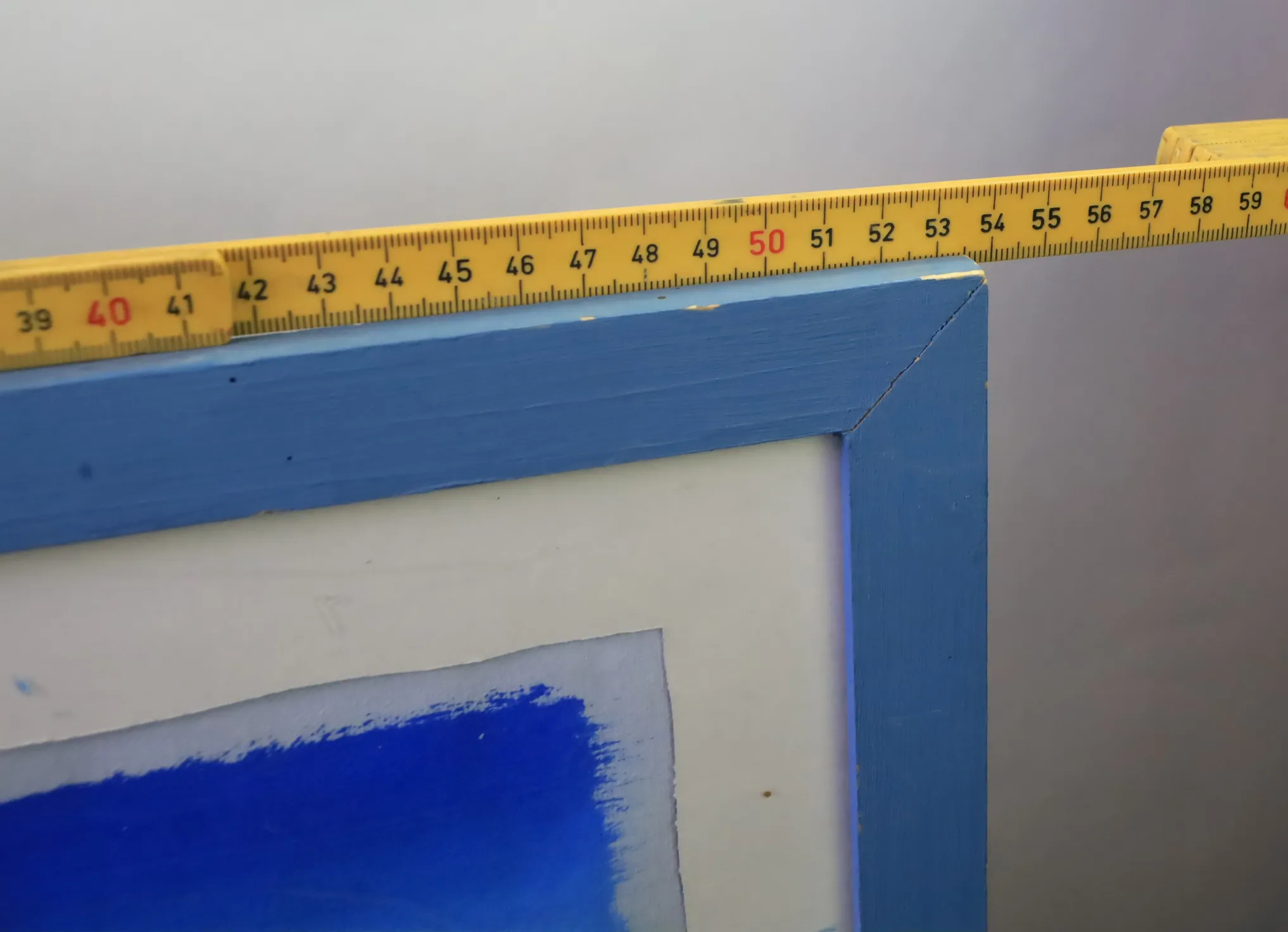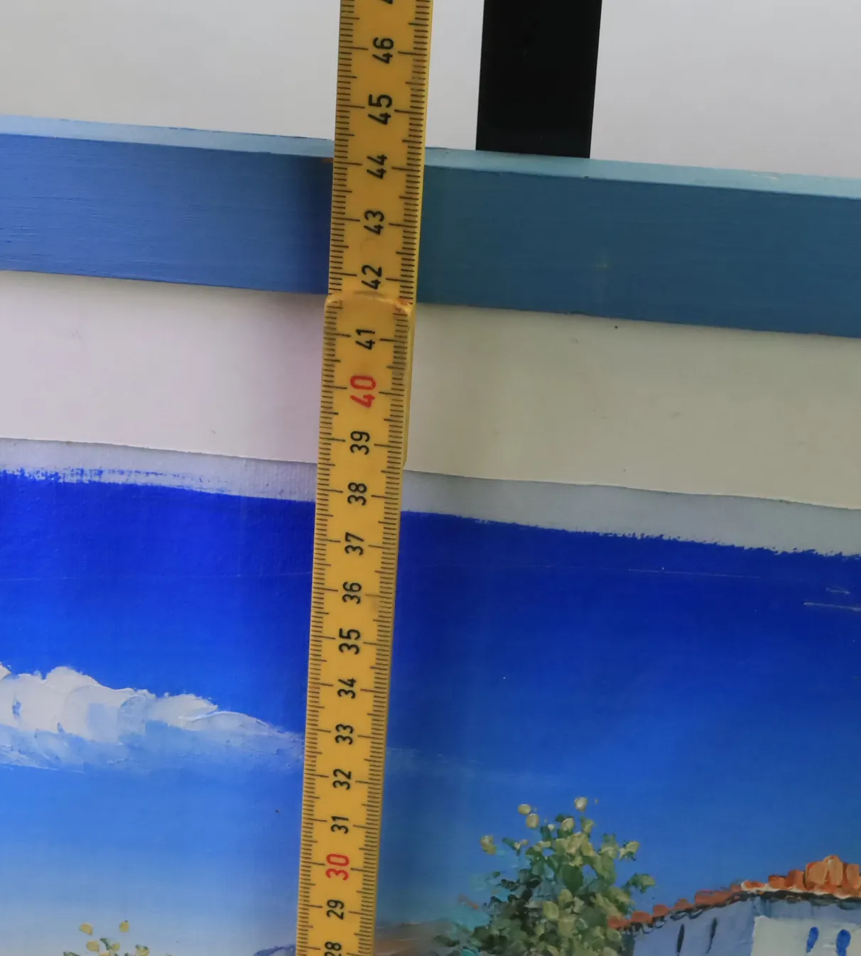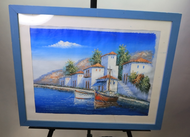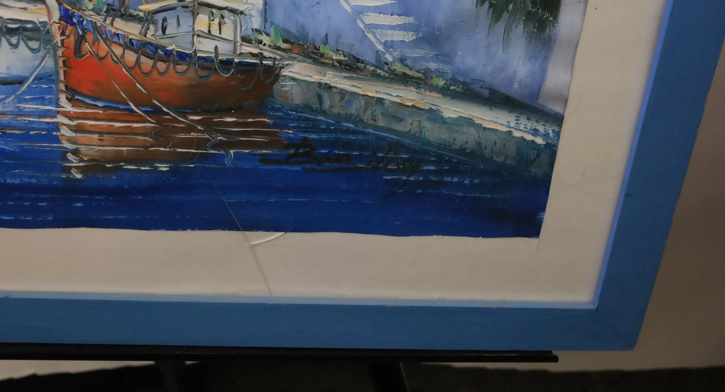 Tavla Båthamn, har fuktskada på passepartout, spricka i plasten.