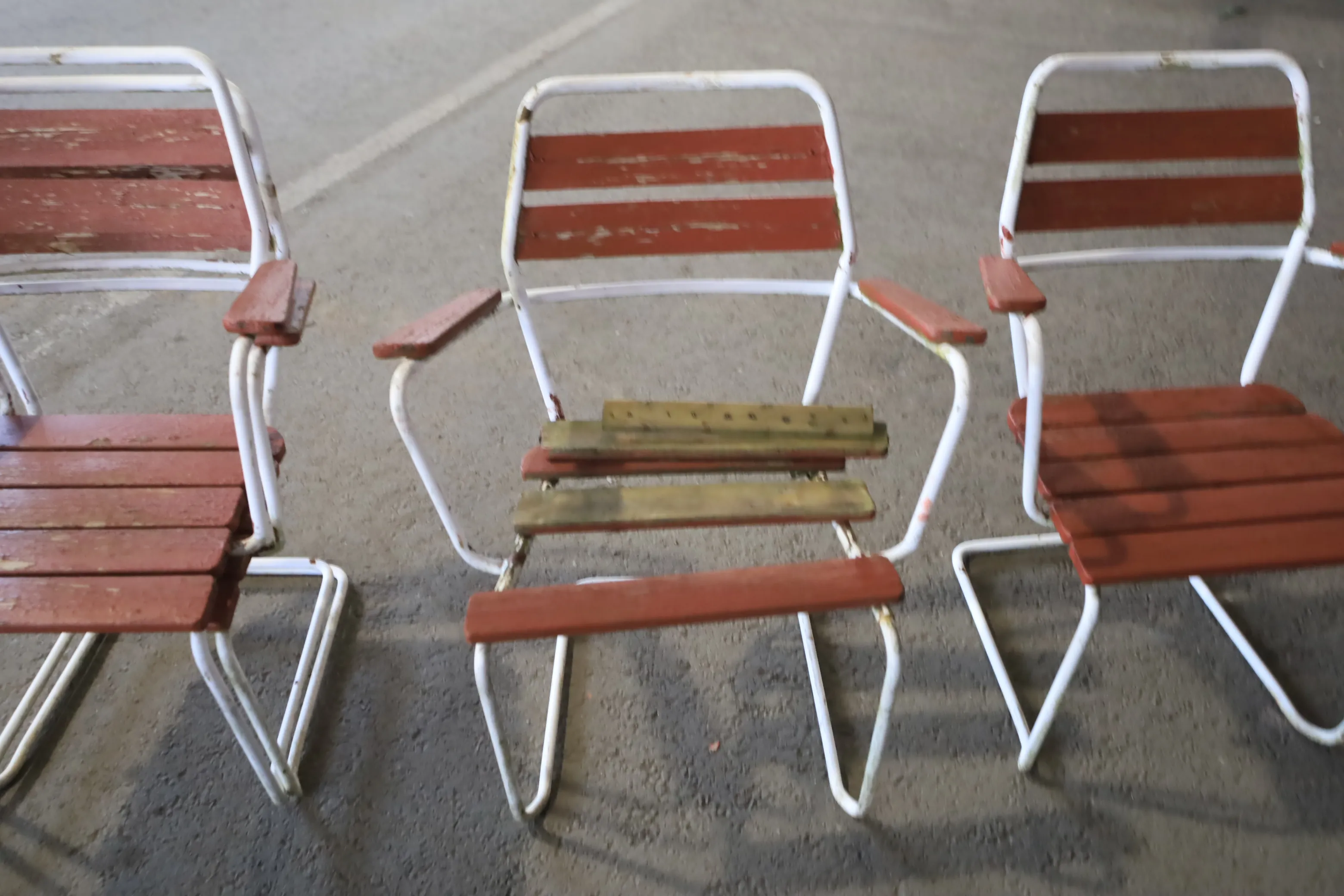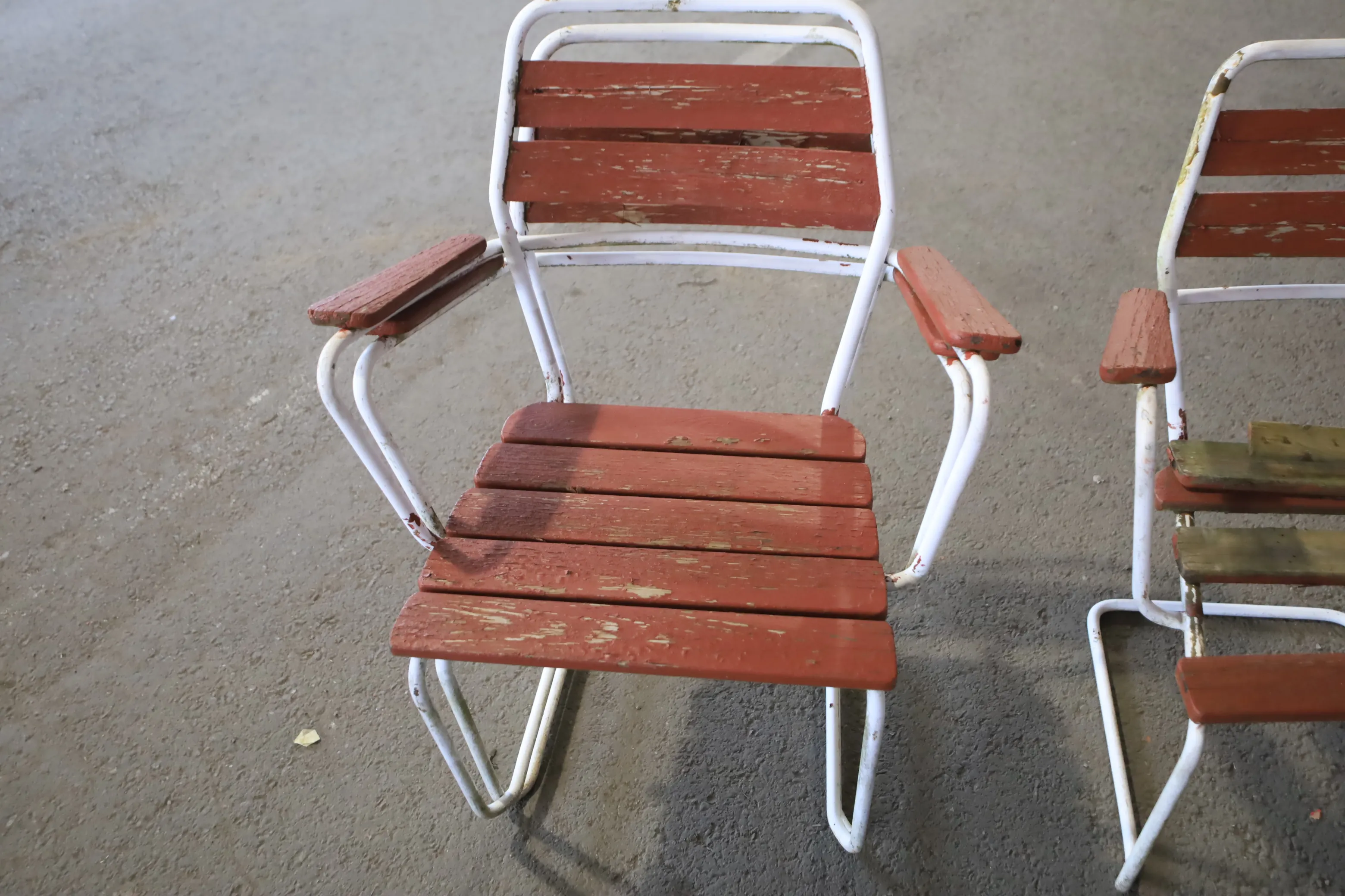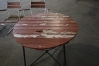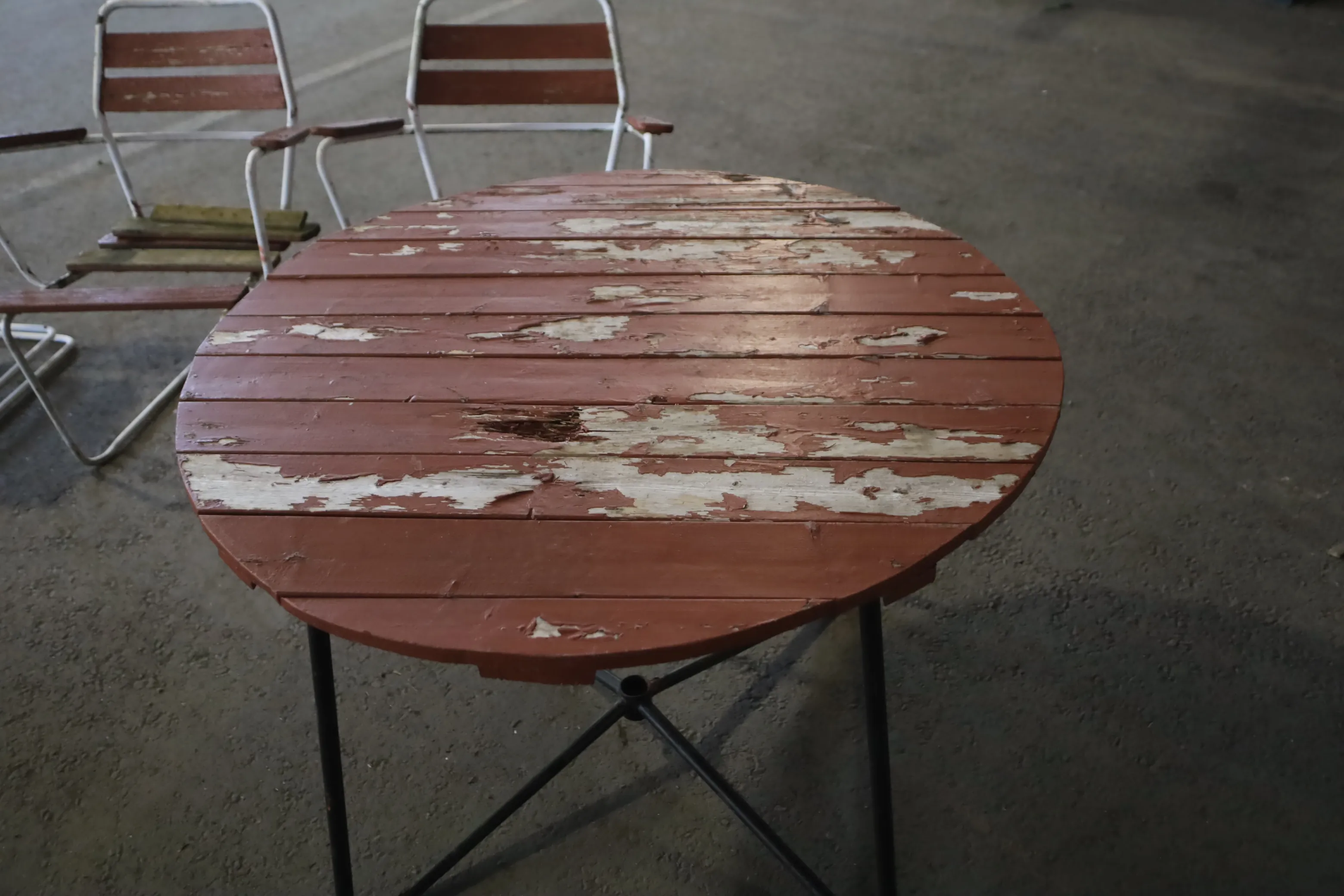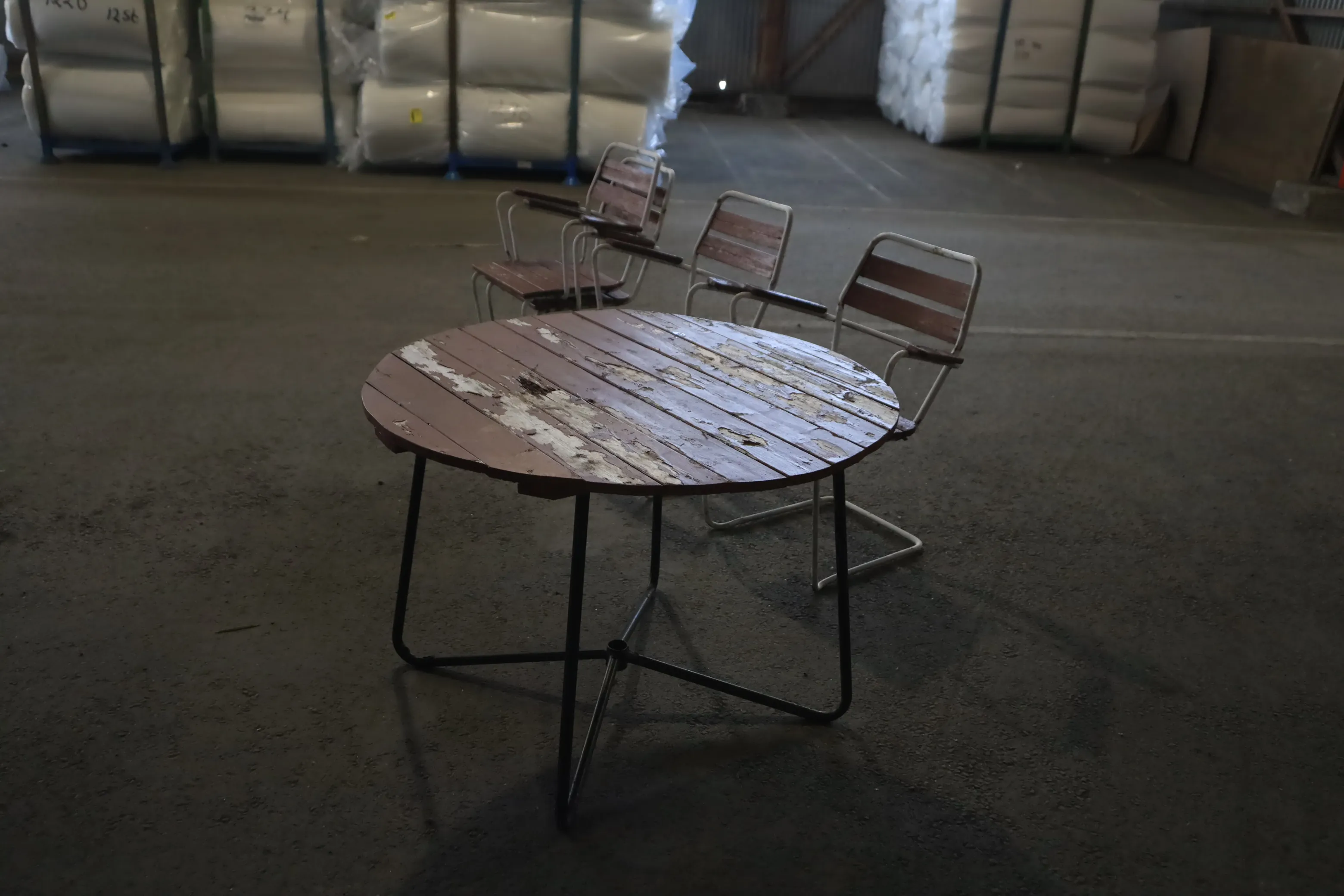 Trädgårdsmöbler bord och fyra stolar. Stolarna i grythyttan stil, brädorna är murkna och behövs bytas.