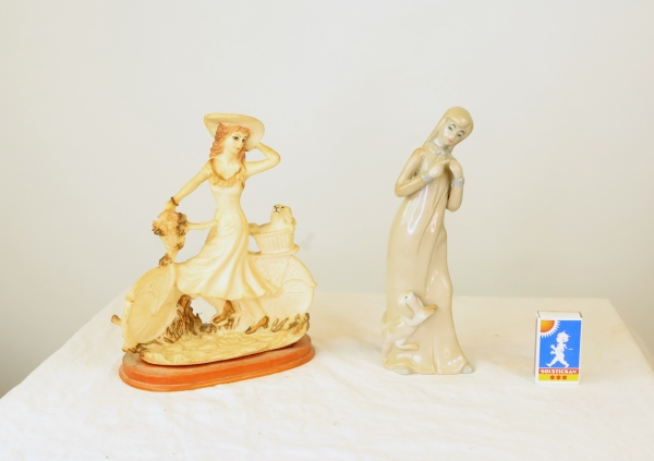 Två figuriner damer med hundar