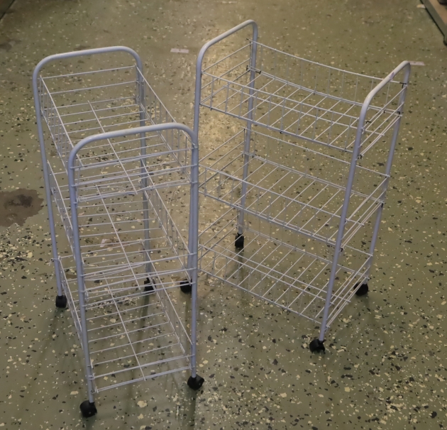 Två korgvagnar. ena saknar delar av hjul