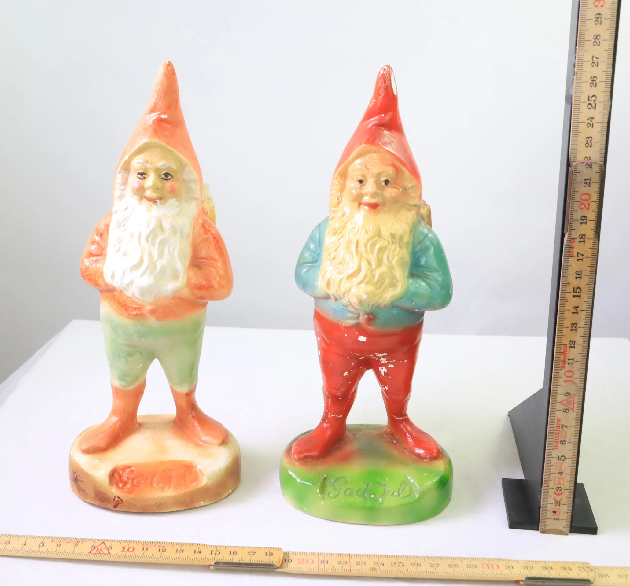 Två tomtar från sekelskiftet i gips, har en del färgbortfall