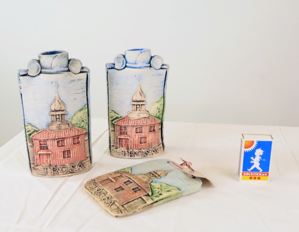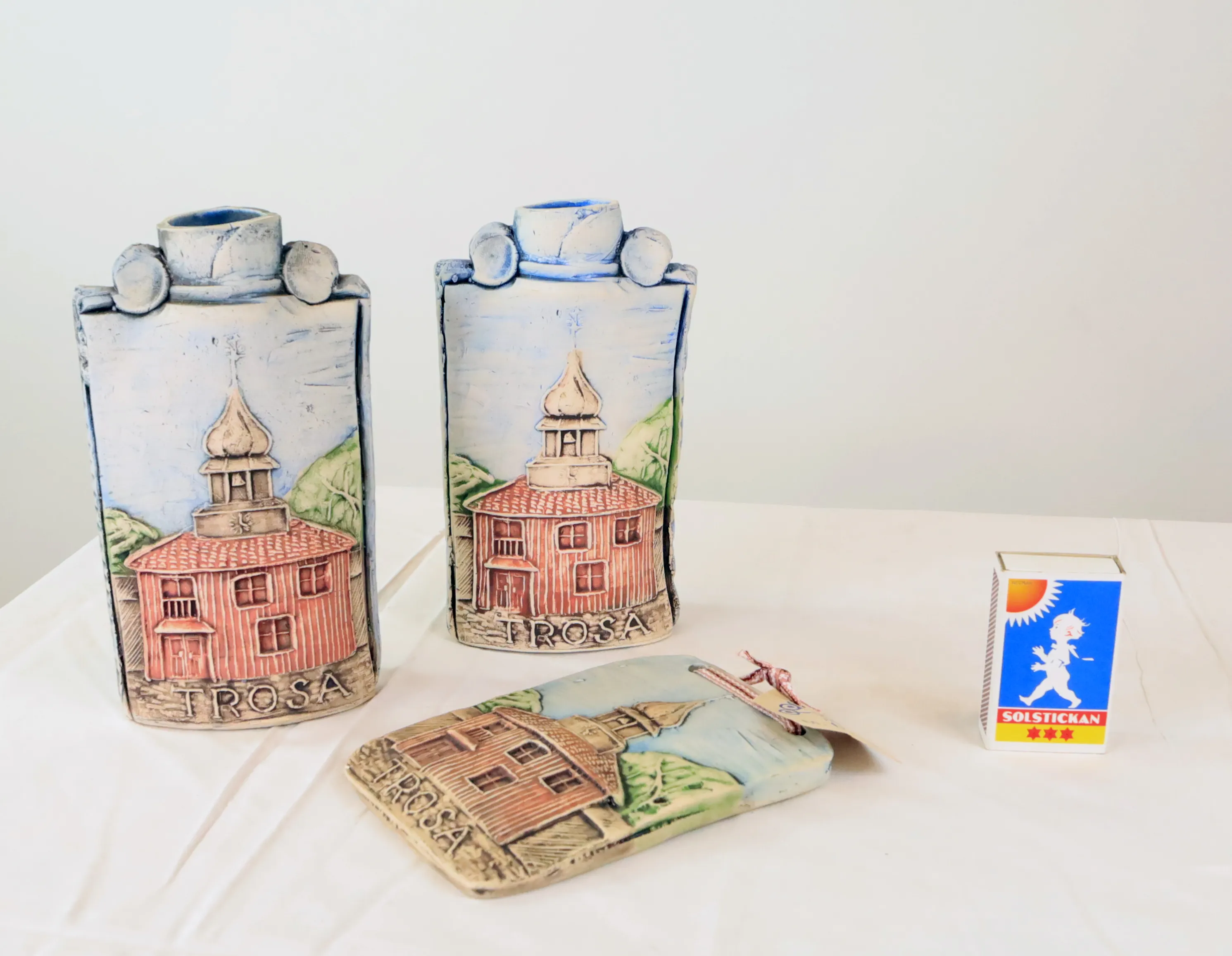 2387. Två vaser och en väggtavla med Trosa motiv