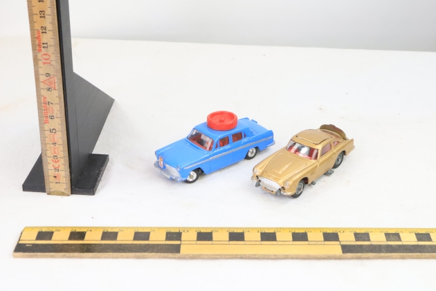Två Corgi bilar, Austin A 60 och James Bond, Jamesbond saknar en gubbe, men kan skjuta upp sätet.