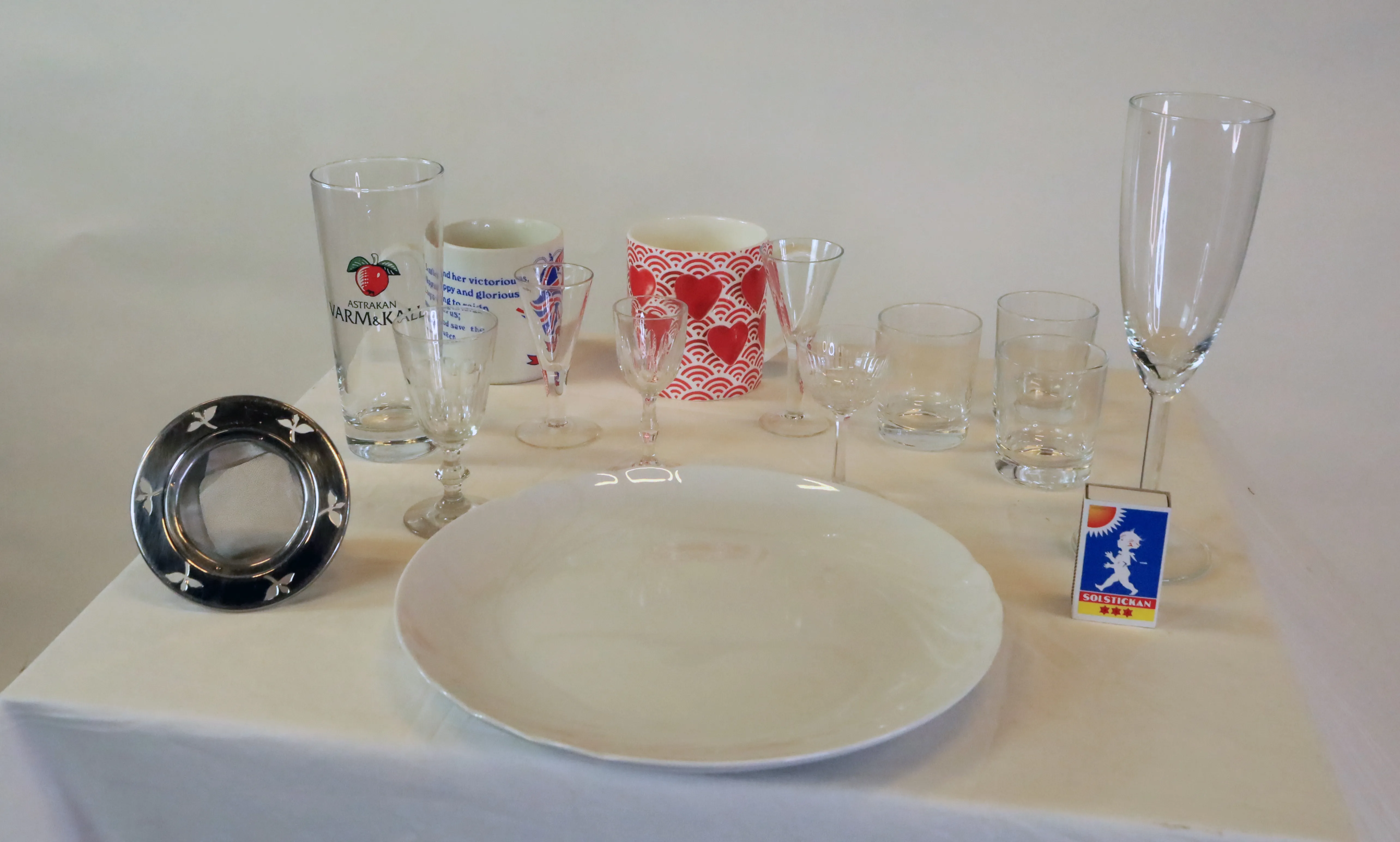Samling udda glas och en tallrik samt en tesil.