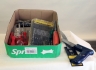 Låda med verktyg, borrar, kniv, såg, skruvmejslar