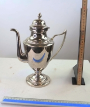 Kaffe Kanna i nysilver, är lite böjd på knoppen
