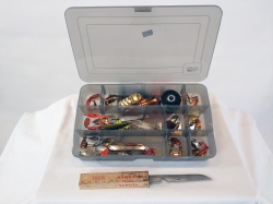 Låda med fiskdrag och fiskekniv