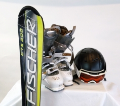 Slalomutrutning för barn. Fischer skidor i glasfiber 150 cm. Hjälm (sizs:s 51-54cm) med glasögon, pjäxor (index 65-85. 25,5) 39 1/2.