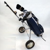 Golf utrustning, vagn och klubbor, bollar, pegs