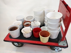 Större stekpanna, stor tuppwareskål, tre shotglas