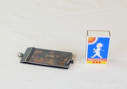 Sedelklämma, kanske i nysilver, har inskriptioner.